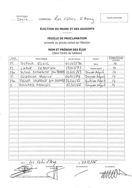 Ce samedi 21 mars 2026, le conseil municipal a procédé à l'élection du nouveau Maire et de ses adjoints.